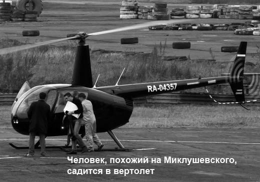 «Вскоре на площадке появился мужчина, очень похожий на губернатора Владимира Миклушевского, и с ним дружная компания. Когда бутылки, пакеты с эмблемой хоккейного клуба «Адмирал» и, как показалось, банные принадлежности погрузили, губернатор занял переднее сиденье, а его приятели уселись на заднем ряду. Вертолет начал взлет. Но через мгновение машина зависла в воздухе, потом её дважды развернуло, и она опустилась на землю. Через некоторое время «Робинсон» снова взлетел, уже уверенно, и взял курс на север.