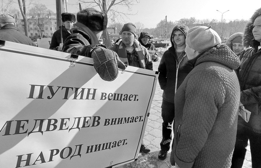 Большое одобрение рядовых горожан получил и плакат «Путин вещает. Медведев внимает. Народ нищает». Люди потихоньку начинают просыпаться после «зимней спячки», осознавая, что не столько враждебные России силы, а собственные правители виноваты в непрекращающихся бедах населения, развале экономики, губительных реформах образования и медицины.