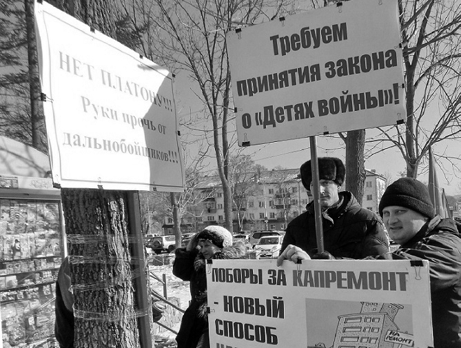 В руках участников пикета – лозунги, отражающие наиболее острые проблемы сегодняшнего дня: «Требуем принятия закона о «детях войны»!», «Поборы за капремонт – новый способ наживы. Хватит кормить жуликов!», «Нет ПЛАТОНУ! Руки прочь от дальнобойщиков!».