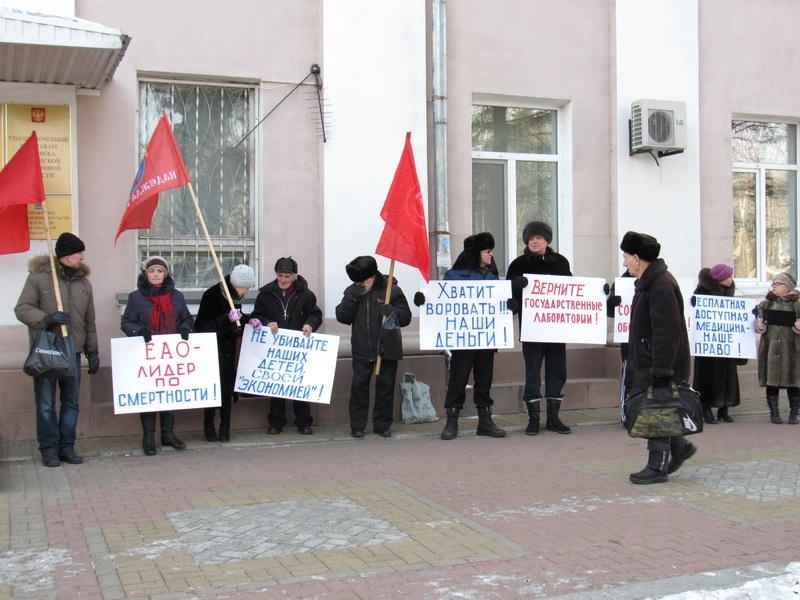 Пикет, организованный совместными силами общественных организаций — коммунистической партией Российской Федерации и Всероссийской женской организации «Надежда России», привлек внимание горожан и гостей столицы ЕАО. Многие единодушно поддержали требования пикетировавших. Люди охотно соглашались подписаться под протестным письмом в адрес правительства ЕАО, в котором выражается недовольство реформой здравоохранения, проводимой в регионе и выдвигается категоричное требование: отправить бездарных чиновников от медицины в отставку.