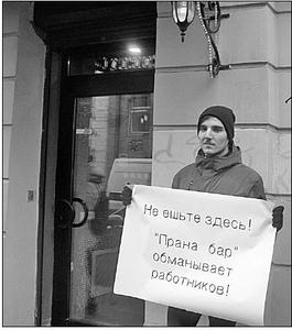 Представители независимых социальных движений и общественные активисты провели пикет у входа в кафе "Прана бар", расположенном на Казанской улице в Санкт-Петербурге. Причина, объединившая собравшихся, может показаться незначительной: молодому человеку Роману Чертовских не доплатили 4000 рублей за ноябрь - декабрь 2015 года, когда он работал в кафе официантом.