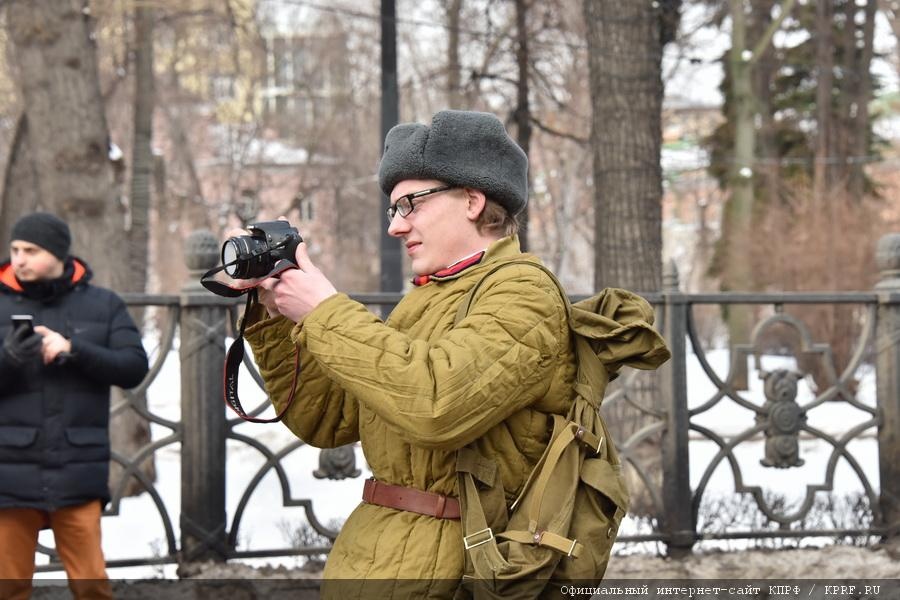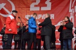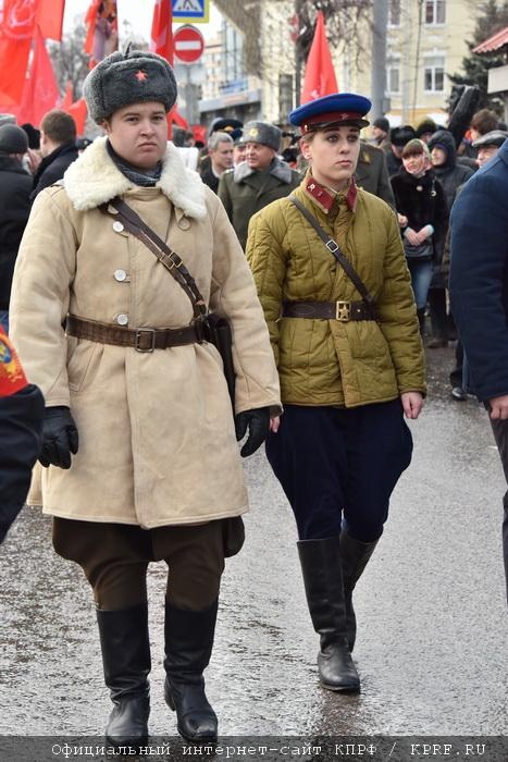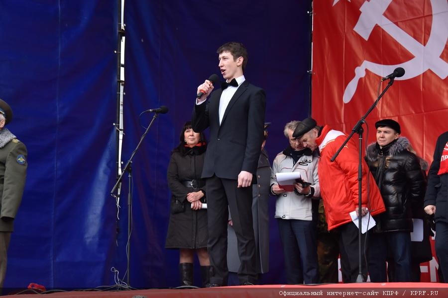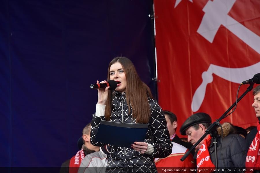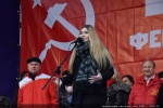 Затем выступила многократная чемпионка мира по пауэрлифтингу среди женщин, комсомолка Марьяна Наумова. Она рассказала о своей поездке в Донецк, где, по ее словам, тысячи женщин встали на защиту своей республики от бандеровских полчищ. Марьяна поздравила с праздником участников митинга, а также ополченцев в Донбассе и российских бойцов в Сирии.