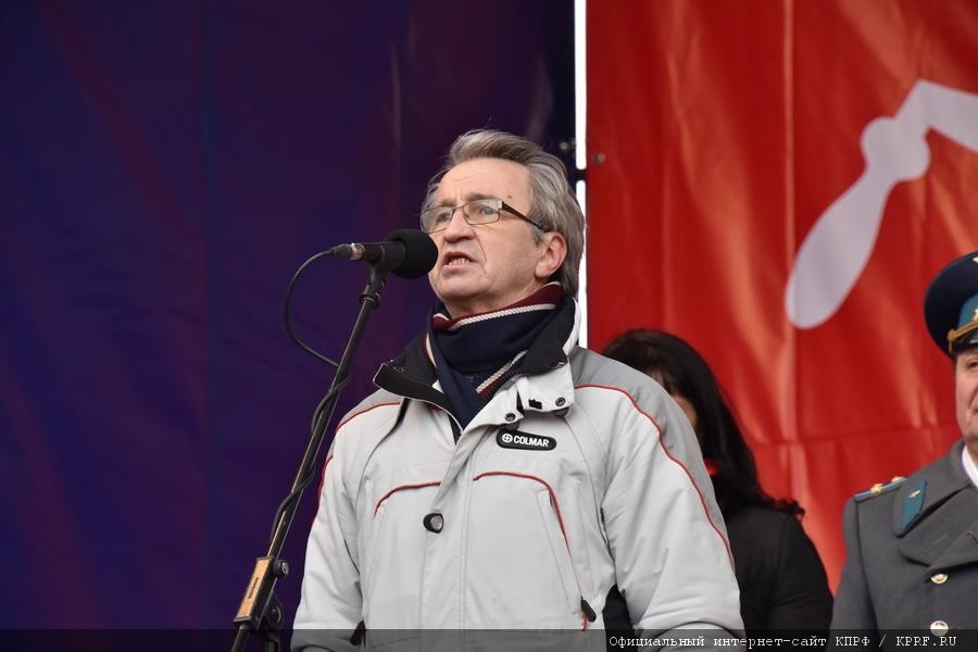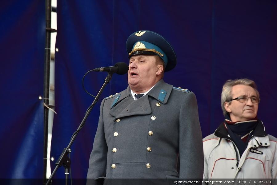 Следующий выступающий, председатель Московского областного отделения Союза советских офицеров России А.Н. Соколов рассказал о двух кольцах угроз для России и нашего народа. Первое кольцо, по его мнению, это внешние силы – страны НАТО. А второе кольцо, считает оратор, это либеральные силы внутри страны, которые существуют на деньги госдепа США. А.Н. Соколов призвал Армию и народ в борьбе против этих сил сплотиться вокруг КПРФ.