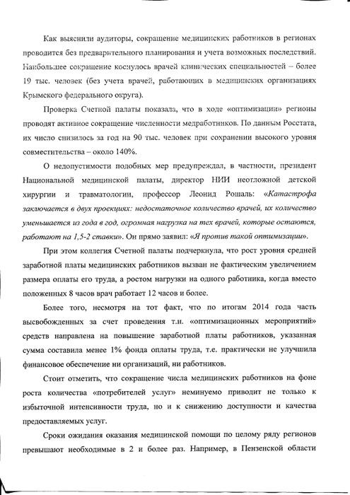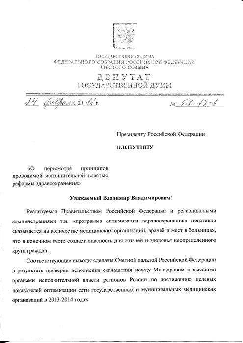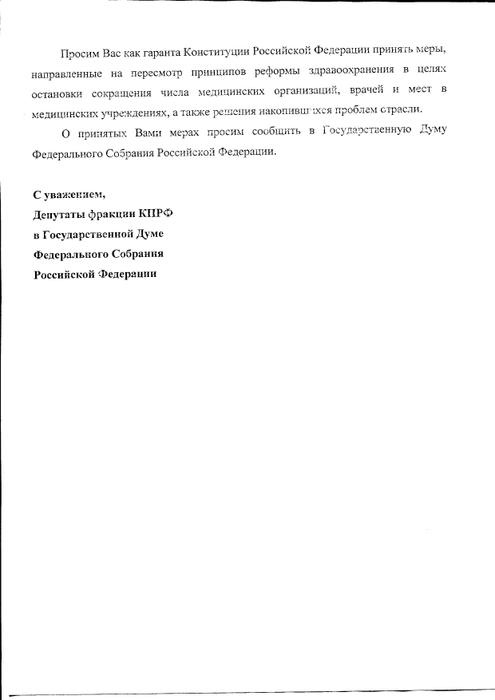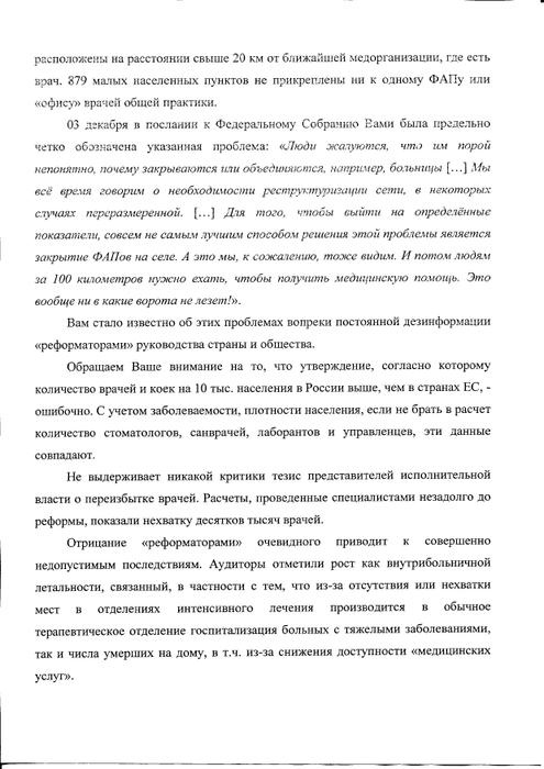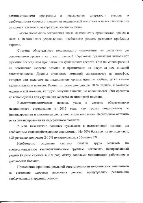 Просим Вас как гаранта Конституции Российской Федерации принять меры, направленные на пересмотр принципов реформы здравоохранения в целях остановки сокращения числа медицинских организаций, врачей и мест в медицинских учреждениях, а также решения накопившихся проблем отрасли.