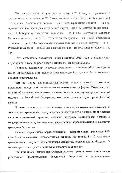 Так или иначе, выявление Счетной палатой прямой взаимосвязи между реализацией Правительством Российской Федерации и региональными администрациями программы и повышением смертности говорит о необходимости срочного изменения медицинской политики в целях обеспечения фундаментального права граждан России на жизнь.