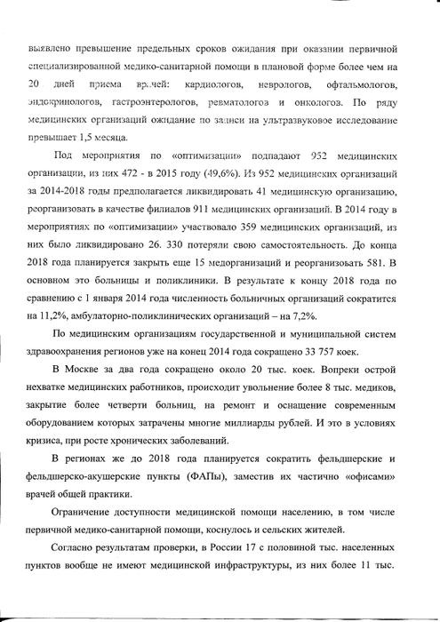 Реализуемая Правительством Российской Федерации и региональными администрациями т.н. «программа оптимизации здравоохранения» негативно сказывается на количестве медицинских организаций, врачей и мест в больницах, что в конечном счете создает опасность для жизней и здоровья неопределенного круга граждан.