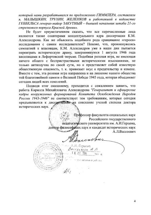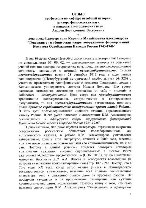 По К.М.Александрову, «Согласие Власова в 1944 году на сотрудничество с Гимлером и офицерами СС (мое замечание: организации, которая признана Международным Нюрнбергским трибуналом как организация преступная, совершившая невиданные злодеяния на территории СССР и на других оккупированных гитлеровскими войсками территориях) стало компромиссной ценой за инструментализацию КОНР и создание армии». Тогда можно задать вопрос и автору: а не является ли его диссертация, реабилитирующая власовцев и их преступления, также «компромиссной ценой» ради получения желаемой ученой степени доктора исторических наук?