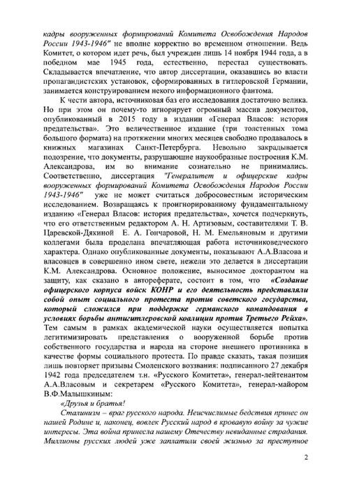 Второе. Автор де-факто, оправдывая предательство власовцев, более того «обеляя» их измену, переводя это в ранг социального якобы протеста, хотел он того или нет, встал на путь «войны» вместе с «власовцами» против СССР, советского народа, против Советской армии, против тех, кто сражался на фронтах в Великой Отечественной войне или в тылу врага, встал на путь «войны» против благодарной Памяти о Великой Отечественной войне, которая так ярко проявилась в шествии «Бессмертного полка» по городам России 9 мая 2015 года. По К.М. Александрову путь предательства, на который стал Власов и его соратники и приспешники, – это «освоиться с новыми реалиями, выжить и сделать карьеру» (с. 30 Автореферата), замечу – «карьеру» в фашистской Германии. При этом он добавляет, очевидно, считая это веским доводом: «Значительная часть власовцев руководствовалась приспособленчеством, вырабатывавшемся за годы пребывания в сталинском социуме…» (с. 29 Автореферата). Что это? – Разве это не клевета ученого-историка на советский строй, на коммунистическую партию, на советский народ, на советскую молодежь, давших, прямо скажем, массовый героизм, только подвиг Александра Матросова повторило, пожертвовав своей жизнью более 630 советских воинов? Кто выиграл Великую Отечественную войну и спас все человечество от немецко-фашистского рабства (перемолов на советских фронтах более 80% живой силы врага), – «приспособленцы»?