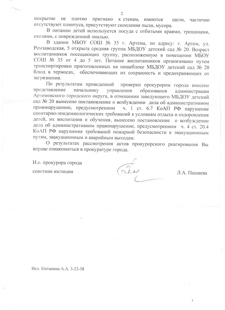 По результатам проведённой проверки прокурор внёс представление начальнику управления образования администрации Артёмовского городского округа Колпаковой Л.Я. об устранении выявленных нарушений. А в отношении заведующей детсадом №20 Семенец Т.В. были возбуждены дела об административных правонарушениях по двум статьям КоАП РФ, санкциями которых предусмотрен денежный штраф от 20 тысяч рублей и выше. Кроме того, как сообщили в мэрии, руководитель оскандалившегося дошкольного учреждения привлечена к дисциплинарной ответственности.