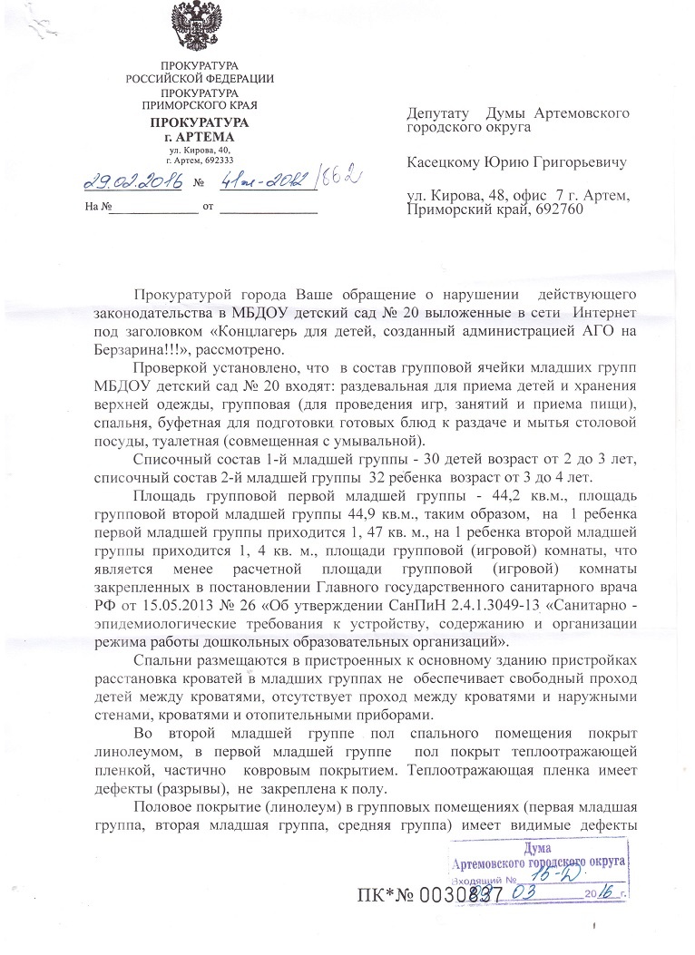 На днях завершилась прокурорская проверка в дошкольном образовательном учреждении №20 Артёмовского городского округа. Основанием для её проведения явилось обращение депутата Думы АГО от фракции КПРФ Юрия Касецкого, одновременно являющегося помощником депутата Государственной Думы ФС РФ Корниенко А.В.