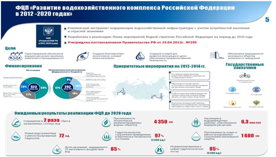 Кроме того, должна быть продолжена работа по выполнению государственных программ (ФЦП «Чистая вода», ФЦП «Развитие водохозяйственного комплекса РФ в 2012-2020 гг», а также ФЦП «Мелиорация») с учетом сегодняшних реалий и оптимизации бюджетных расходов и выполняемых мероприятий.