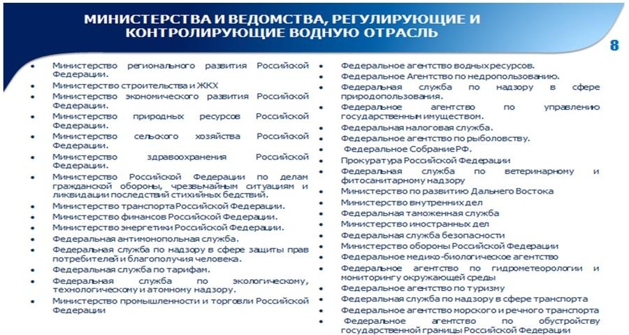 Одной из основных причин сложившейся ситуации, по нашему мнению, является отсутствие в России единой системы управления водным хозяйством, которое в силу его многогранности и масштабности не умещается в круг интересов ни одного из действующих министерств. Вопросы регулирования использования водных ресурсов находятся в ведении 14 федеральных органов исполнительной власти. По данным экспертов, проблемами водной отрасли так или иначе занимаются 36 федеральных ведомств.