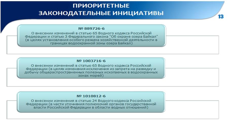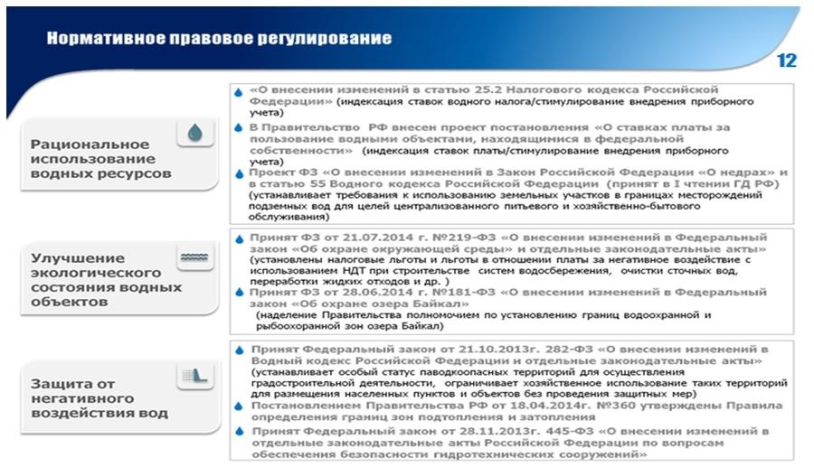 Эффективно дополняя друг друга, данные законодательные акты вывели правовое регулирование охраны окружающей среды на новый уровень. Именно этими законодательными актами созданы действенные стимулы к проведению технологической модернизации экономики, сформирована законодательная база для развития экологически-эффективных технологий и их масштабного внедрения. Убежден, в результате мы получим значительный экологический эффект, в том числе в сфере охраны и использования водных ресурсов.