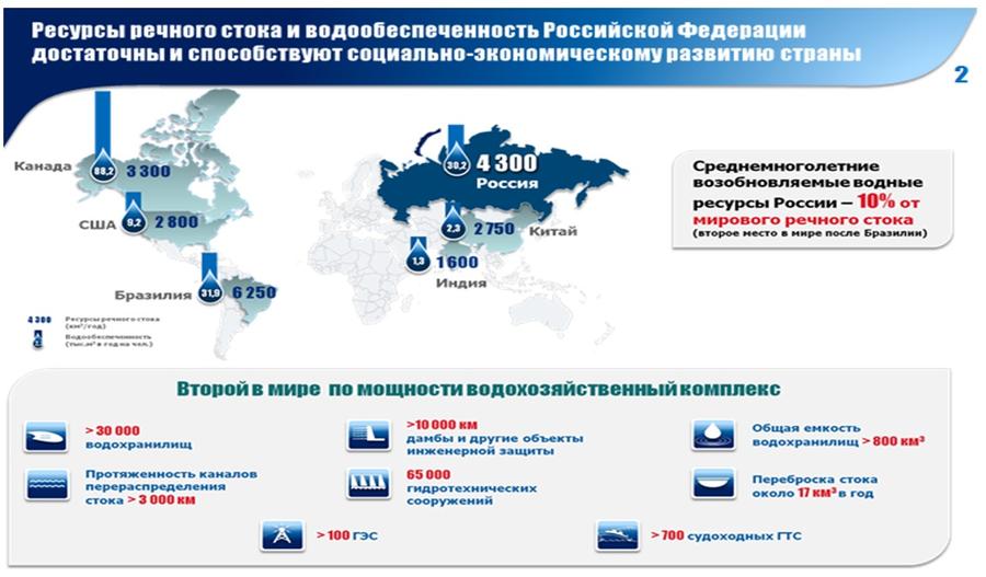 В Российской Федерации функционирует водохозяйственный комплекс, который является одним из крупнейших в мире и включает более 30 тыс. водохранилищ и прудов общим объемом свыше 800 куб. км и полезным объемом 342 куб. км. Сеть каналов межбассейнового и внутрибассейнового перераспределения стока, водохозяйственных систем воднотранспортного назначения общей протяженностью более 3 тыс. км позволяет осуществлять переброску стока в объеме до 17 куб. км в год.