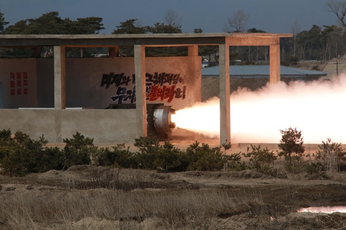 Первый секретарь ТПК, Первый председатель ГКО КНДР, Верховный Главнокомандующий КНА Ким Чен Ын на месте руководил работой надземного испытания соплования сверхмощного реактивного двигателя ракеты с твердым топливом и отделения ее ступени.