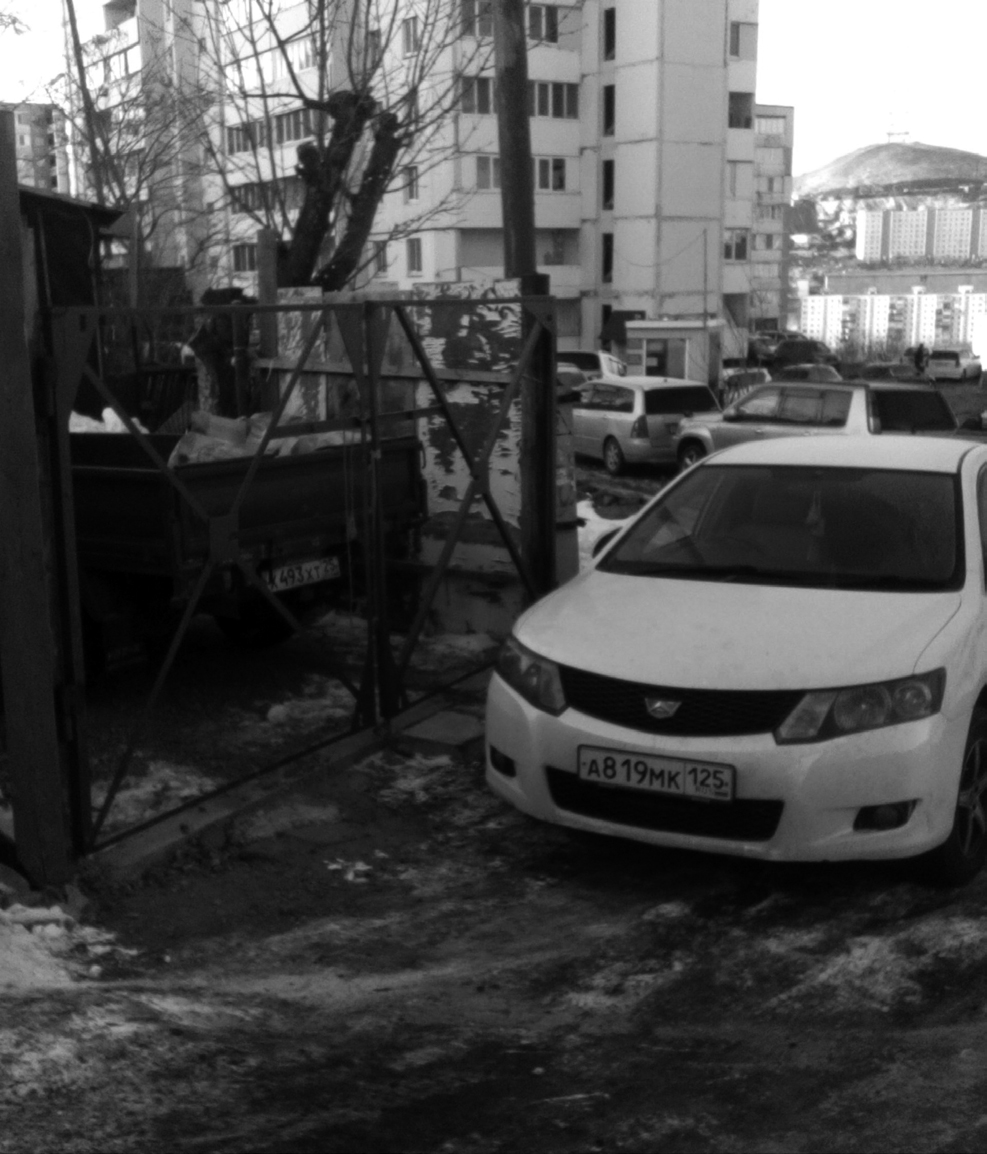 Вызываю через 911 ДПС. Запрос приняли, никакой реакции. Делаю запрос опять. Позвонили. Обрисовал ситуацию. Приехал представитель дорожно-патрульной службы. Ознакомился лично с проблемой и сказал, что ДПС помочь ничем не может. По телефону нашёл владельца, далее - перекупившего владельца. Владелец сообщила, что она в Уссурийске и помочь ничем не может. На этом всё и застопорилось, хотя выезд со двора выходит на перекрёсток, а остановка и стоянка на перекрёстке запрещена. Представитель ДПС покинул место происшествия. Вечером приехала владелец и убрала машину.