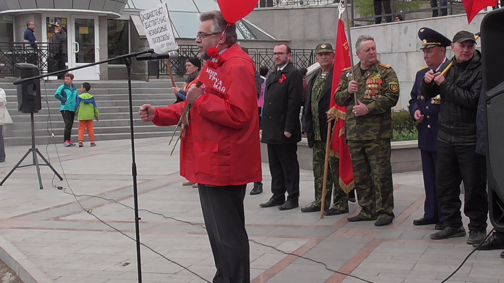Митинг открылся под гимн советского союза в исполнении оркестра Тихоокеанского флота, Первым слово было предоставлено секретарю ЦК КПРФ, депутату Государственной Думы ФС РФ Алексею Корниенко. В своем выступлении он передал привет от Председателя ЦК КПРФ Г.А.Зюганова. Напомнил собравшимся, что праздник 1 мая был учрежден в память о рабочих г.Чикаго, которые на маевке потребовали введения 8 часового рабочего дня. Власти разогнали митинг рабочих, а пятерых его участников повесили. Впервые в мире 8-часовой рабочий день был установлен после революции, при Советской власти. С реставрацией капитализма в России были утеряны многие из социальных прав трудящихся, и теперь за них вновь приходится бороться.