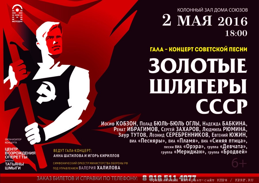 2 мая в Москве в Колонном зале Дома Союзов состоялся праздничный гала-концерт советской песни «Золотые шлягеры СССР». Мероприятие прошло при поддержке КПРФ. На нем выступил Председатель ЦК КПРФ Г.А. Зюганов.