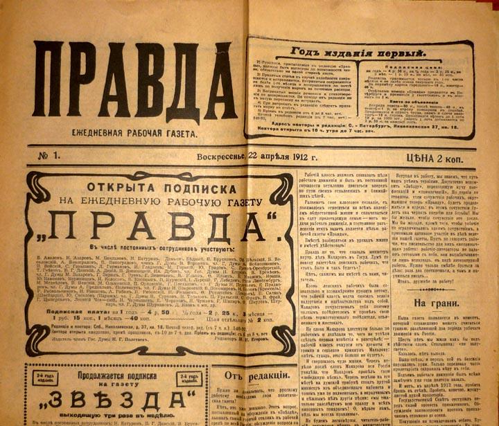 «Правда» родилась на волнах революционного подъёма в знаменитые «ленские дни». Появление на свет массовой рабочей газеты «Правды» в эти именно дни знаменовало собой 1) ликвидацию периода общей усталости в стране после Столыпинской «тишь да гладь», 2) мощное пробуждение русского рабочего класса к новой, второй после 1905 года, революции и 3) начало завоевания широких масс рабочего класса на сторону большевиков.