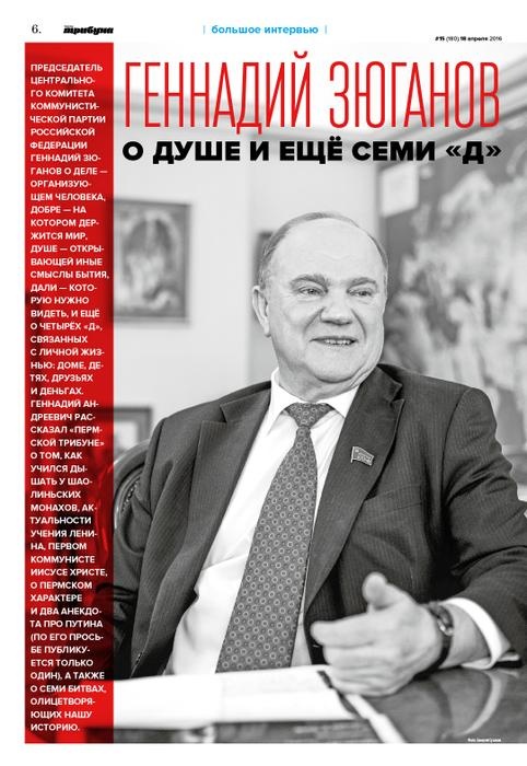 Председатель Центрального Комитета Коммунистической партии Российской Федерации Г.А. Зюганов о деле — организующем человека, добре — на котором держится мир, душе — открывающей иные смыслы бытия, дали — которую нужно видеть, и ещё о четырёх «д», связанных с личной жизнью: доме, детях, друзьях и деньгах. Геннадий Андреевич рассказал «Пермской трибуне» о том, как учился дышать у шаолиньских монахов, актуальности учения Ленина, первом коммунисте Иисусе Христе, о пермском характере и два анекдота про Путина, а также о семи битвах, олицетворяющих нашу историю.