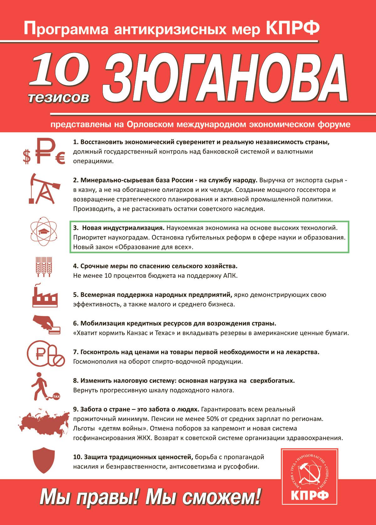 У нас, у коммунистов, есть план выхода страны из кризиса. Он состоит из 10 пунктов, ясных и понятных. Если вкратце: восстановление экономического суверенитета страны, возвращение наших 7 триллионов из американской экономики, контроль над банками, национализация минерально - сырьевой базы, и не только (это увеличит бюджет с 13 до 20 трлн.). Ликвидация оффшоров (добавит ещё 3,5 трлн. доходов). Отказ от НДС и в целом от удушающей налоговой системы. Прогрессивный налог на сверхбогатых (ещё 4,5 трлн. в казну). Госмонополия на водку и курево (плюс 3,3 трлн. добавочно). И т.д. А твердят – денег нет. Их полно, они валяются под ногами…