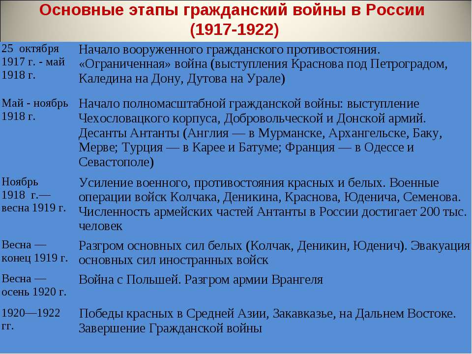 Ни о какой независимости России тогда, в 1918г. интервенты и слышать не хотели. Но получили неожиданный для себя отпор. А потому решили поддержать внутреннюю контрреволюцию. Так что вовсе не большевики, а именно иностранные интервенты развязали Гражданскую войну. Они обеспечивали армии Колчака и Деникина, Юденича и Врангеля оружием и боеприпасами, снаряжением и обмундированием, современной техникой, в том числе танками и самолётами – в обмен на территории России (а красным не хватало не то что оружия – даже патронов! Всё больше шашки да щтыки). Недаром говорили о Колчаке: «Мундир английский, погон французский, табак японский, правитель омский».