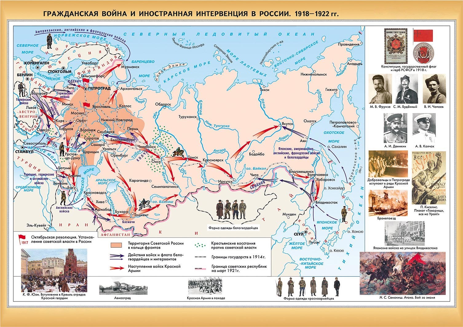 Великая Октябрьская социалистическая революция прошла почти бескровно, и во всей стране триумфально установилась Советская власть. Но – уже в декабре 1917г. Англия и Франция заключили соглашение о подготовке вооружённой интервенции и разделе России на «сферы влияния». К ним присоединились США, Япония и другие – всего 14 государств стремились разделить между собой шкуру неубитого «русского медведя». Рассчитывали на лёгкую победу. И мы оказались в кольце фронтов… Недаром многие историки считают Гражданскую войну войной отечественной – вся Европа плюс США и Япония зарились на наши территории и богатства. Как в 1812г., когда вместе с Наполеоном на нас шла вся Европа. Как в 41-м, когда с Гитлером против нас воевала опять-таки вся Европа. И сегодня снова Европа готова идти против нас, правда, теперь уже во главе с США. Как видим, ничто не изменилось в этом мире за последние 100-200 лет…