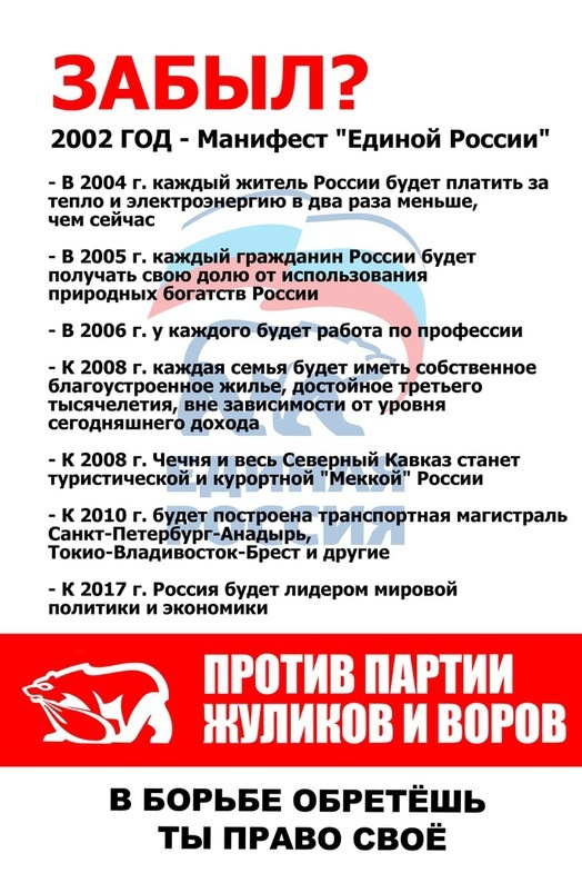 Встречи с избирателями необходимы, чтобы отчитаться единороссам за свое «законотворчество». Но отчеты заменены очередным громким шоу, призванным увести нынешних депутатов и всю партию власти от ответственности за непопулярные законы, за развал экономики, за обанкроченные предприятия, за провалы в сельском хозяйстве. Цель – обман избирателей, понуждающий их клюнуть на новенького, свеженького кандидата от партии власти.