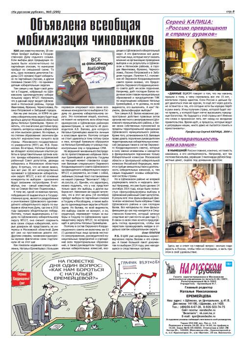 Молчат по этому поводу и правоохранительные органы. Например, наша Щелковская прокуратура Московской области уже год молча наблюдает, как все районные мероприятия, организованные на бюджетные деньги, оформляются как мероприятия партии «Единая Россия», а множество людей, взрослых и детей, одариваются подарками с эмблемой этой партии. Все рекламные щиты с официальными поздравлениями ко всем праздникам, начиная с Нового года, были утыканы едроссовским медведем. Такого беспредела еще никогда не было, что говорит о стремлении партии власти любым путем набрать в Госдуме конституционное большинство.