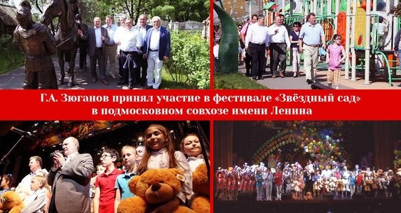 29 мая, накануне Дня защиты детей в подмосковном совхозе имени Ленина прошёл ежегодный детский фестиваль «Звёздный сад». В самом начале мероприятия почётные гости: председатель ЦК КПРФ Геннадий Зюганов, заместитель председателя ЦК КПРФ Владимир Кашин, первый секретарь МК КПРФ Николай Васильев, секретарь МК КПРФ Александр Наумов посетили детский городок, открывшийся в прошлом году.