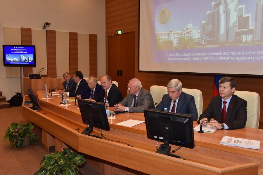 Затем Г.А. Зюганов предоставил слово Ж.И. Алферову. Жорес Иванович в своей лекции провел исторические параллели: он сравнил по степени гениальности Альберта Эйнштейна с Михаилом Лермонтовым. Эти два гения к своим 26 годам жизни сделали важные открытия: Лермонтов – в области литературы, Эйнштейн – в области физики.