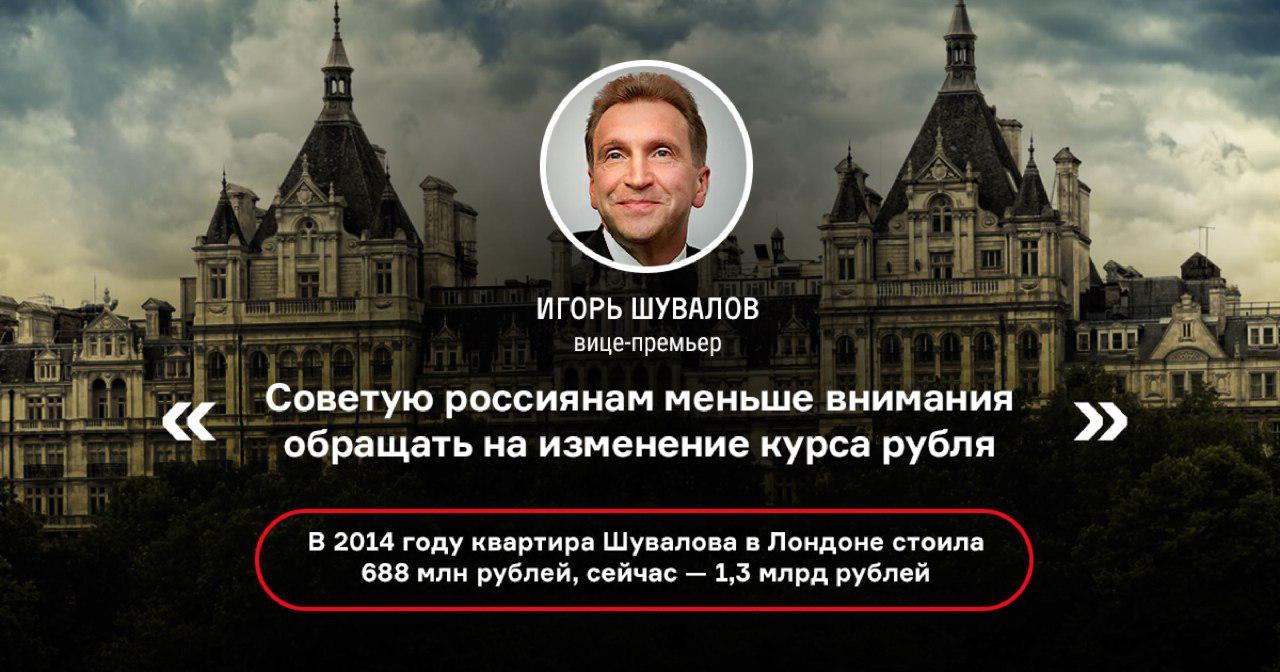 Беннеттс пишет, что Шувалов высмеял "крошечные" квартиры для бедных россиян, являясь "ключевым союзником Владимира Путина, владеющим роскошным пентхаусом в Вестминстере". Со ссылкой на известное расследование ФБК журналист пишет, что российскому вице-премьеру принадлежит в Лондоне квартира площадью почти 500 квадратных метров с шестью спальнями и видом на Темзу. И добавляет, что Шувалову также принадлежит замок в Австрии (через подконтрольную ему и его жене компанию) и Rolls-Royce за 40 млн рублей, передает InoPressa.ru.