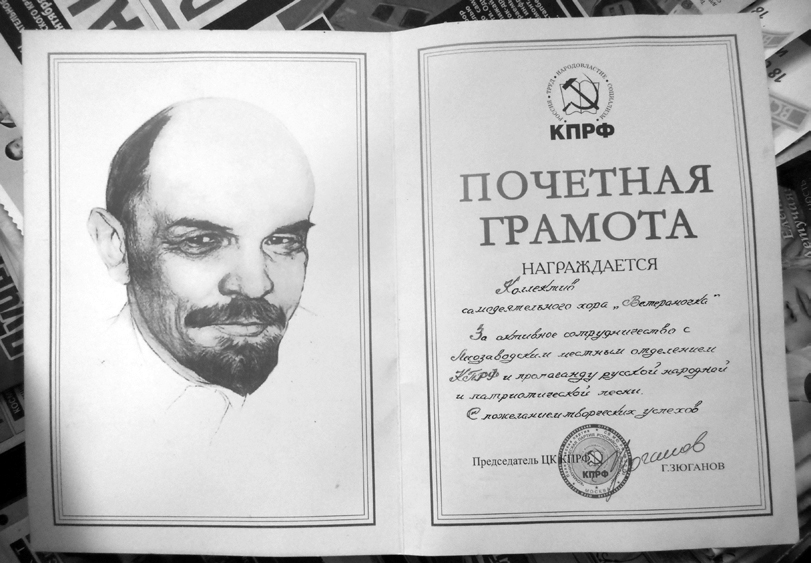 весёлые песни люди слушают и в городе, и в сёлах Лесозаводского городского округа. И на этот раз выступление хора было встречено с восторгом. Слушатели просили не забывать их и навещать почаще. Нежданно- негаданно для самой «Ветераночки» коммунисты приготовили сюрприз и для неё – самодеятельным артистам первый секретарь Лесозаводского местного отделения вручила почётную грамоту Центрального Комитета КПРФ за подписью его председателя Г.А. Зюганова.