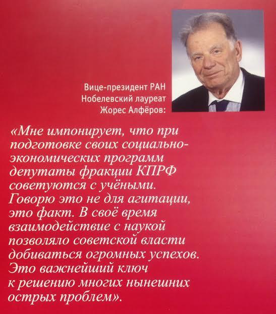 Мне импонирует, что при подготовке своих социально-экономических программ депутаты фракции КПРФ советуются с учёными. Говорю это не для агитации, для меня это факт. В своё время взаимодействие с наукой позволяло советской власти добиваться огромных успехов. Это важнейший ключ к решению многих нынешних острых проблем, которые стоят перед нашей страной.