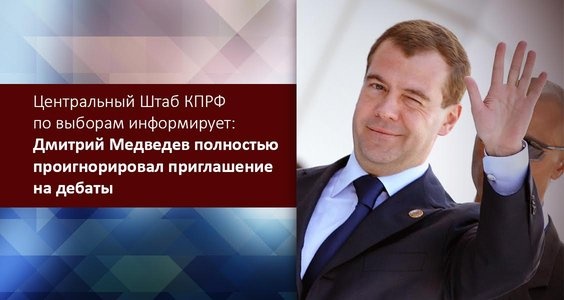 Напоминаем вам: 7 сентября, заблаговременно, Центральный Штаб КПРФ по выборам официально направил обращение в Центральную приемную Председателя «Единой России» Д.А. Медведева с приглашением принять участие в дебатах.