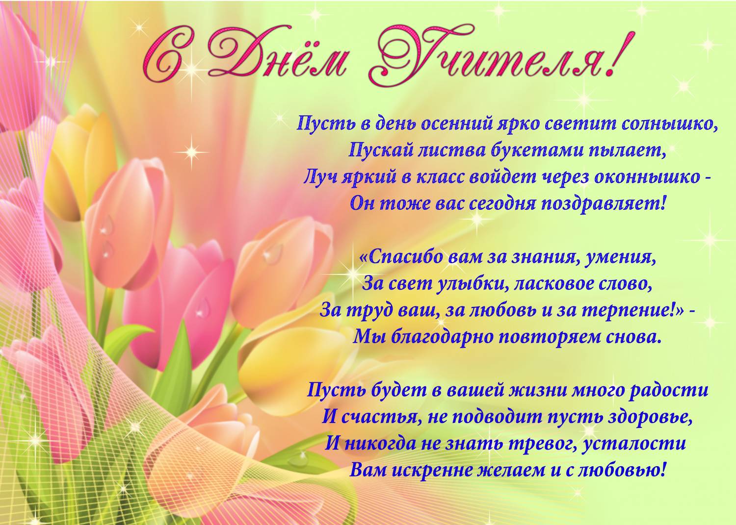 Много добрых, хороших слов хочется сказать сегодня в Ваш адрес. Есть такая профессия - учить детей. Сколько труда и терпения нужно, чтобы из маленьких, непослушных детей выросли успешные, стремящиеся к своей цели люди!