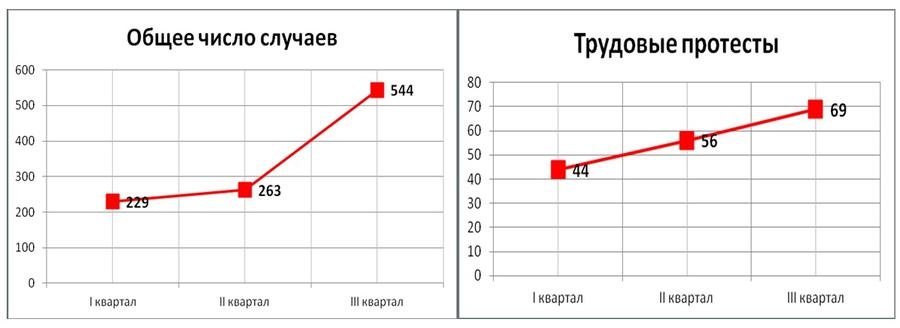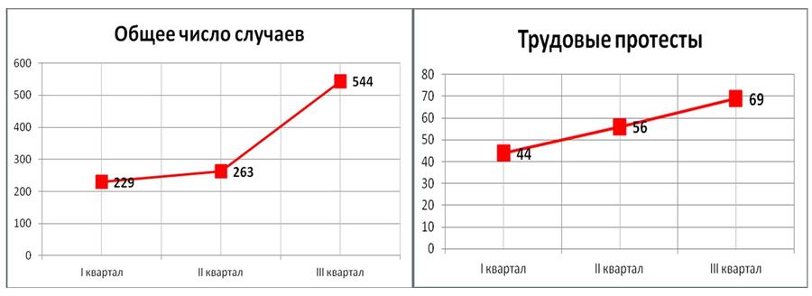 По сравнению со II кварталом число конфликтных случаев выросло примерно в 2 раза (во II квартале было зафиксировано 263 случая). Выросло и число собственно трудовых протестов: в III квартале зафиксировано на 13 таких случаев больше .