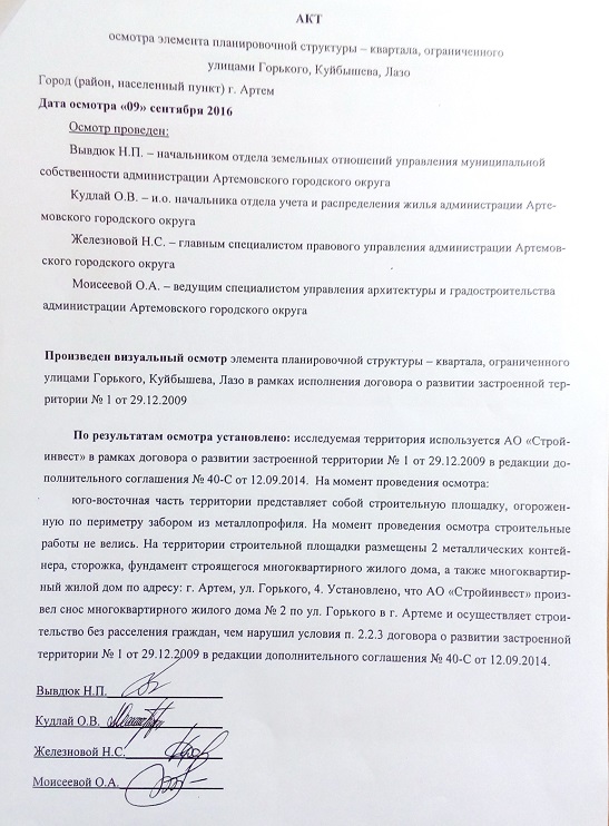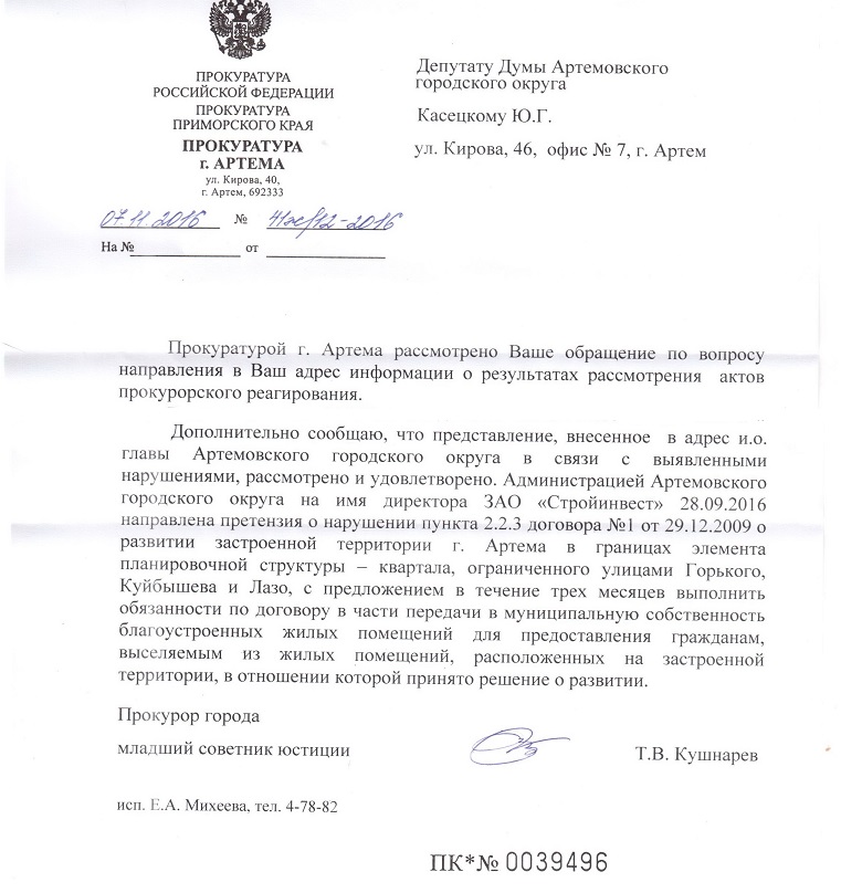 В ходе проверки было установлено, что администрация Артемовского городского округа проявила полное бездействие, не осуществляя контроль за исполнением со стороны ЗАО «Стройинвест» взятых обязательств по переселению граждан, оказавшихся в зоне перспективной застройки. По результатам проверки прокуратурой города Артема главе Артемовского городского округа было внесено представление об устранении выявленных нарушений.