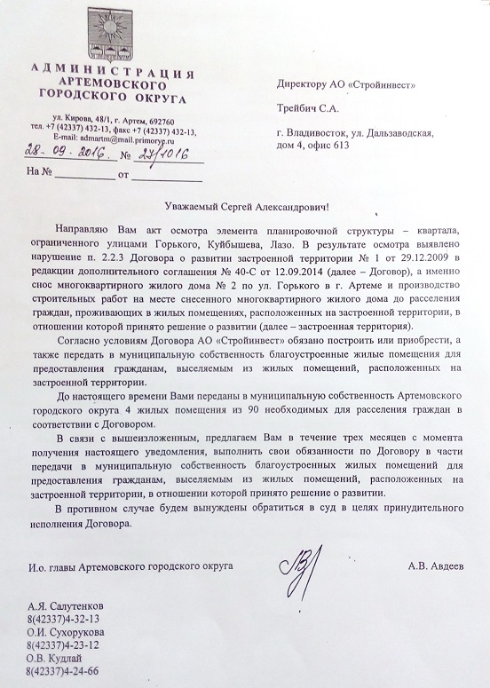 И, как стало известно буквально на днях, представление прокурора города Артема было рассмотрено и удовлетворено. Согласно полученной информации, исполняющий обязанности главы Артемовского городского округа Авдеев А.В. направил в адрес руководителя АО «Стройинвест» претензию о нарушении им п. 2.2.3 Договора №1 от 29.12.2009 г., согласно которому застройщик обязан был построить или приобрести и передать в муниципальную собственность благоустроенные жилые помещения для обитателей бараков на улицах Горького, Куйбышева, Лазо до начала строительства, которое фактически уже началось, и даже был произведен снос одного из ветхих домов.
