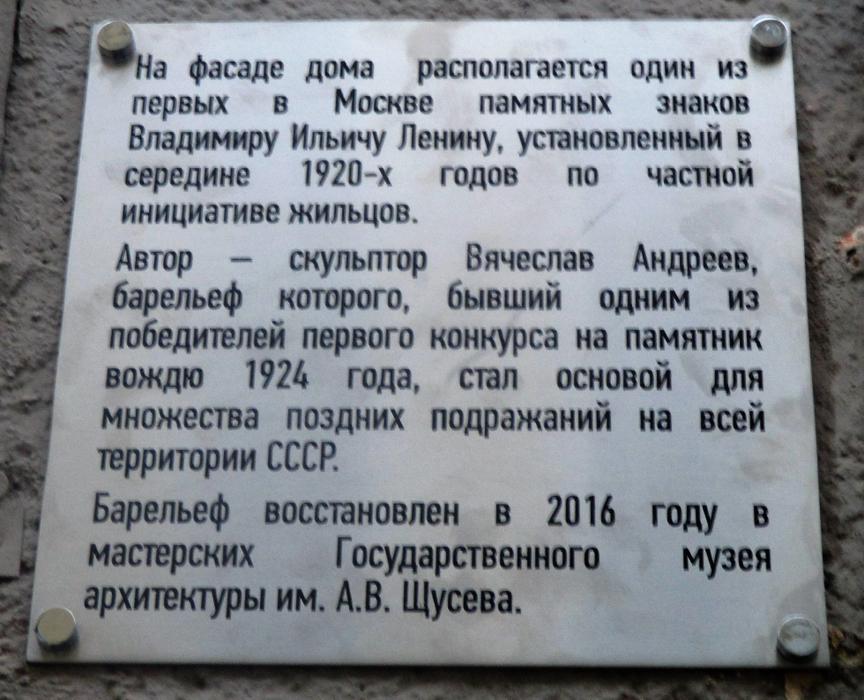 Есть серьезные основания полагать, что автором барельефа является Вячеслав Андреев- младший брат известногоскульптораНиколая Андреева. Впервые Андреев увидел Ленина в Кремле в конце 1919 года. В 1920 году братья присутствовали на заседаниях II конгресса Коминтерна, где Вячеслав сделал более 50 зарисовок выступающего Ленина. В них ему удалось с документальной точностью зафиксировать позу Ильича, его манеру говорить. Андреев был и среди тех, кто в феврале 1924 года откликнулся на призыв правительства к мастерам изобразительного искусства, которые имели возможность при жизни В.И. Ленина «писать с него портреты или лепить его скульптурное изображение, делать рисунки и снимки», представить «оригинальные произведения, изображающие В.И. Ленина». Среди пятисот поступивших работ лучшим был признан именно барельеф Андреева. Вместе с маской и барельефом работы Ивана Шадра он был рекомендован к массовому воспроизведению. «Возможно, данный барельеф – и представляет собой конкурсную работу Андреева. Если это подтвердится, то это будет это здорово. Возможно также, это данный барельеф - первый памятник Ленину, установленный в Москве», - делится предположениями Станислав Чижиковский.
