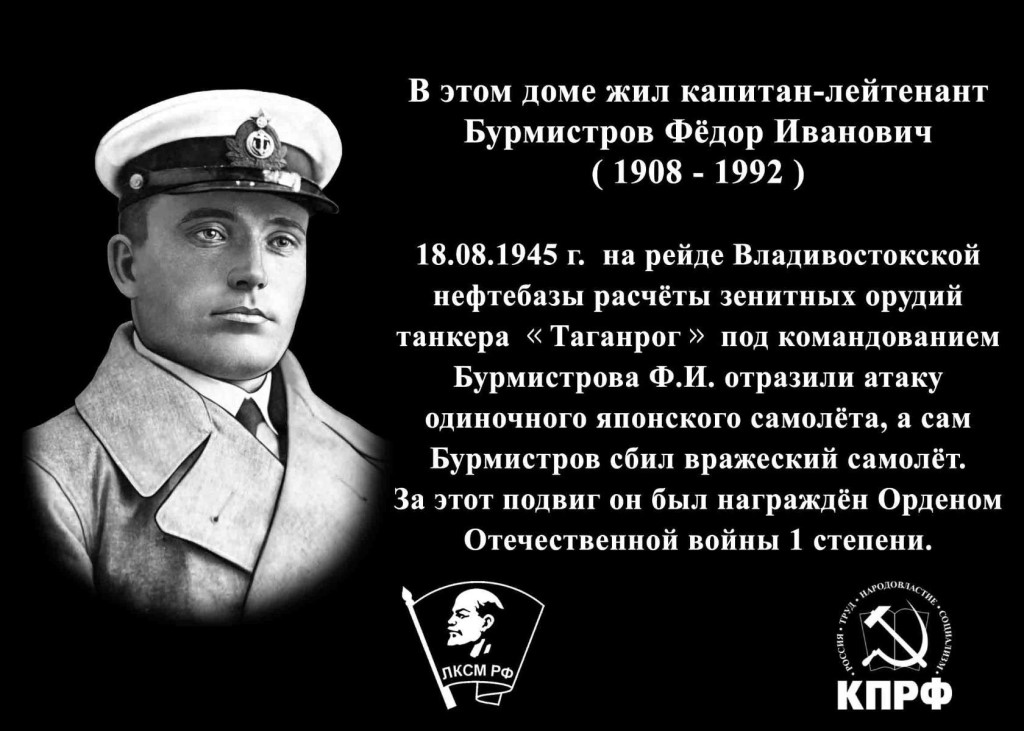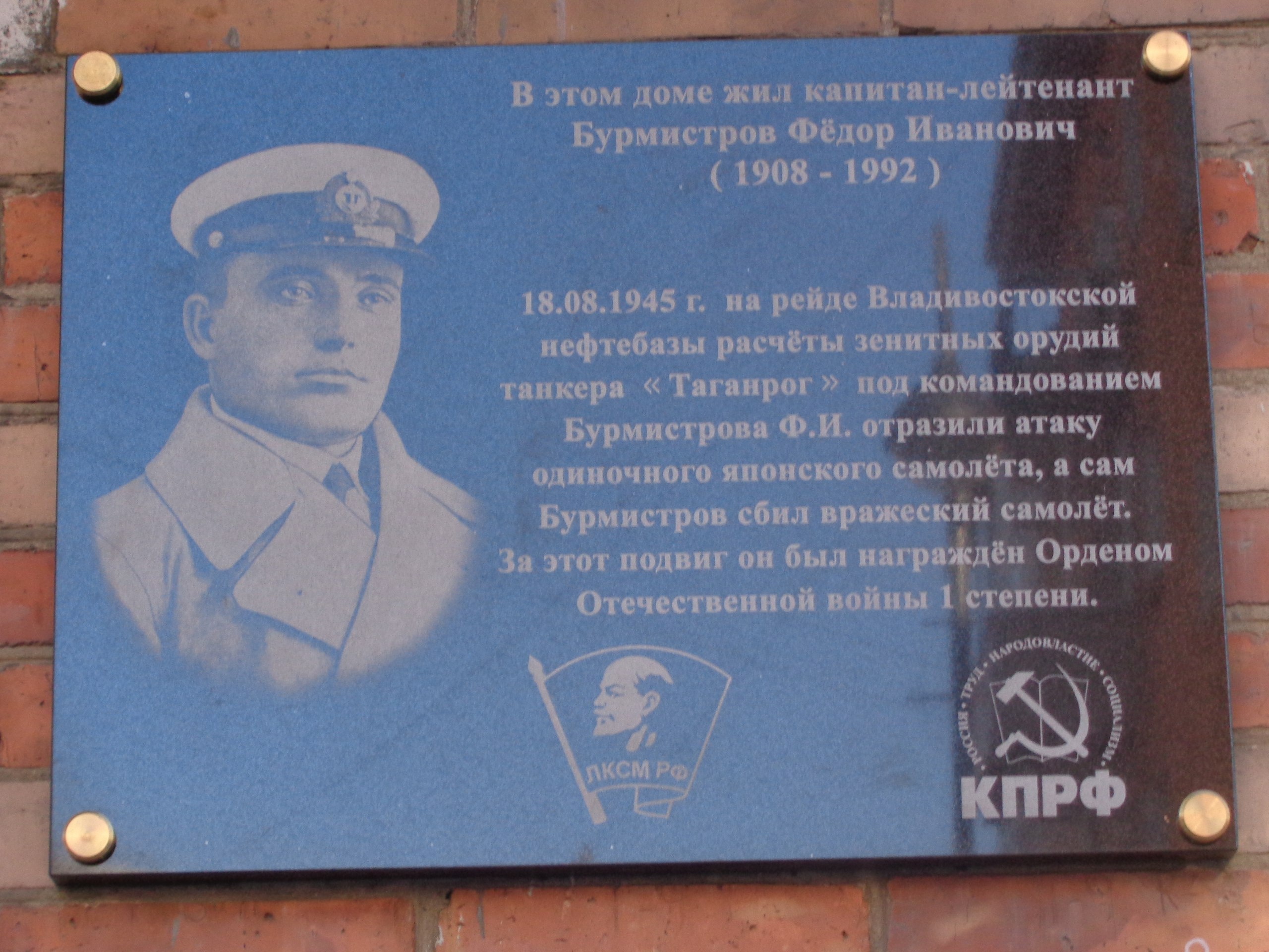15 ноября 2016 года в городе Владивосток по адресу улица Семеновская дом № 32 при активной поддержке и участии Приморского краевого отделения ЛКСМ РФ была установлена мемориальная доска Федору Ивановичу Бурмистрову. Памятный митинг открыл представитель музея Тихоокеанского флота Ю.Н. Сыромятников. Он рассказал собравшимся о подвиге Ф.И. Бурмистрова, что моряки – краснофлотцы не теряли бдительность, даже находясь в глубоком тылу и при приближающемся окончании войны. Далее выступил первый секретарь Приморского краевого отделения КПРФ А.Н.Долгачев. Он напомнил, что подвиг Советского солдата отдавшего свою жизнь за мирное небо над головой никогда недолжен, быть забыт! Также на митинге выступили председатель совета ветеранов города Владивостока Кондратенко С.А., представители ветеранской организации Дальневосточного пароходства, депутат Думы города Владивостока от КПРФ Шукевич А.В. и племянник Ф.И. Бурмистрова. Родственник героя-дальневосточника поблагодарил всех неравнодушных граждан за увековечивание подвига Федора Ивановича.