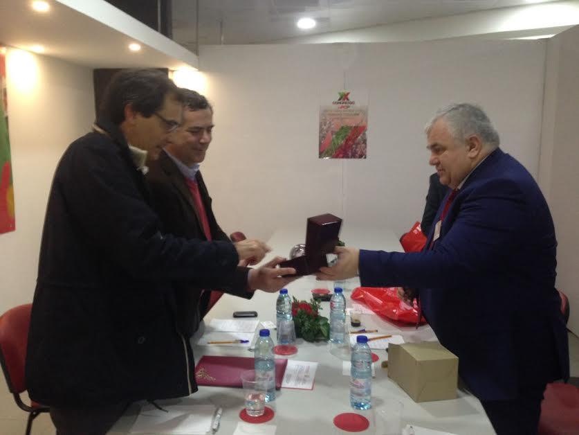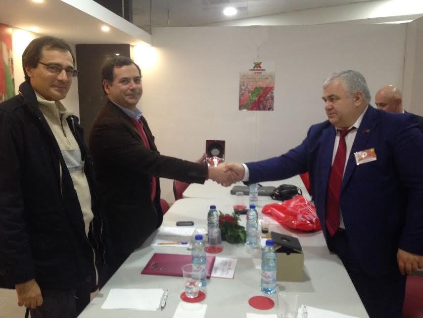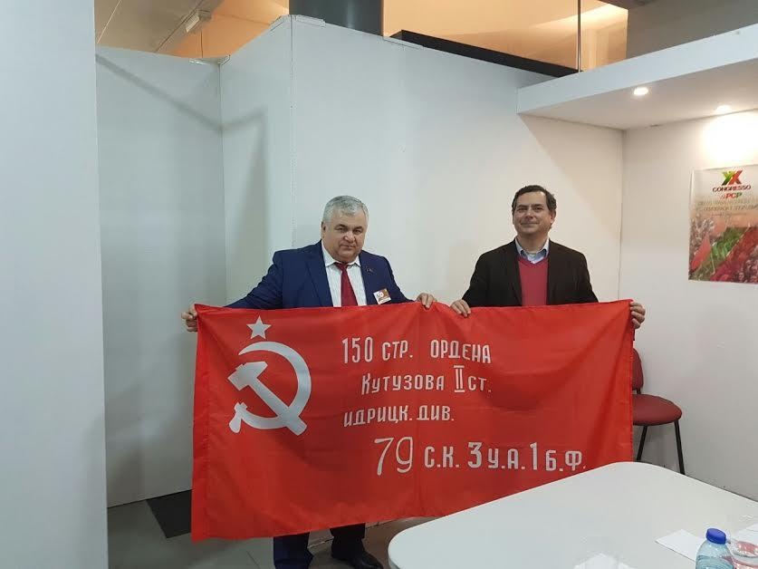 В заключение встречи К.К. Тайсаев от имени ЦК КПРФ и Председателя ЦК КПРФ Геннадия Андреевича Зюганова вручил португальским товарищам приветственный адрес и точную копию Знамени Победы, специальные памятные сувениры. Также приветственный адрес Компартии Беларуси, по просьбе наших товарищей, был вручен руководству Португальской Коммунистической Партии.