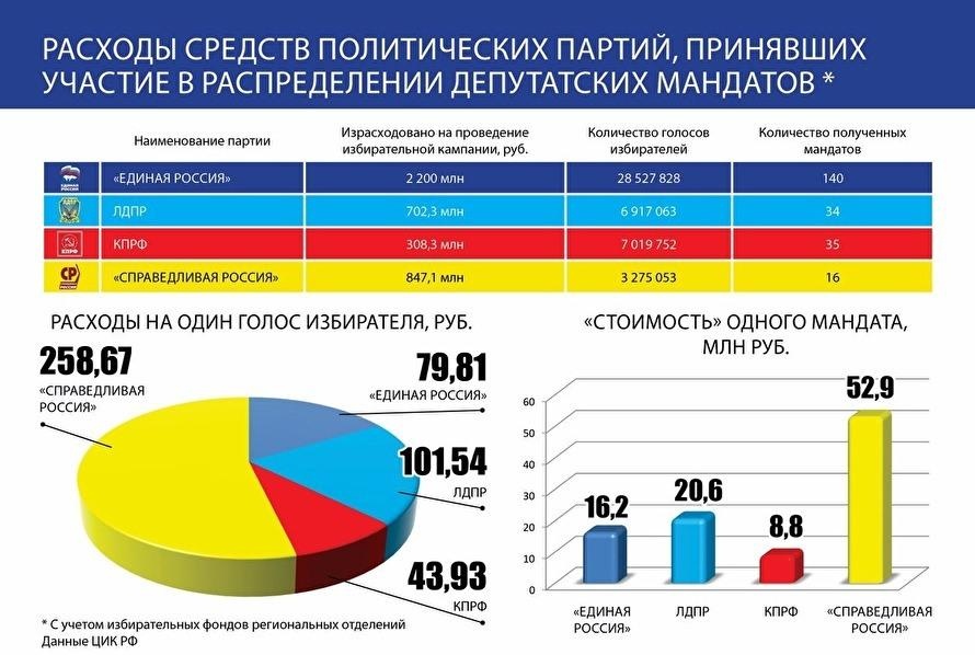 Партия «Справедливая Россия» заплатила самую высокую цену за каждый из мандатов, полученных по итогам сентябрьских выборов в Государственную думу. Это следует из отчета о расходах средств на выборы седьмого созыва Госдумы, который подготовил и направил в адрес госорганов Центризбирком. Дешевле всего мандаты и голоса избирателей обошлись КПРФ.