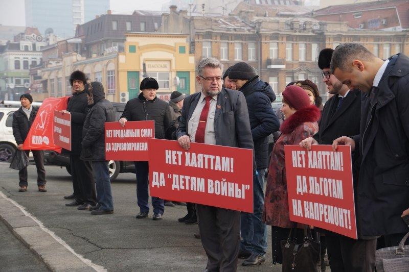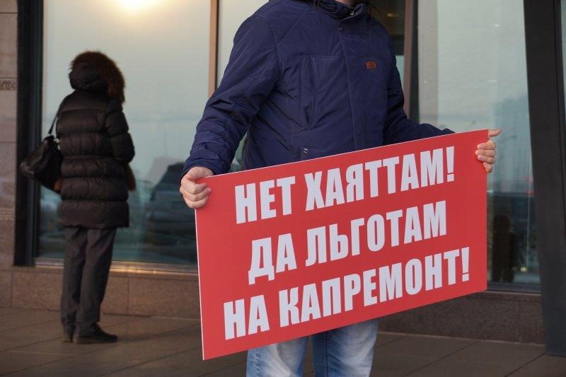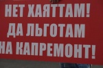 Встреча прошла под лозунгами: "Нет Хаяттам!", "Да льготам на капремонт", "Нет жуликам и ворам! Да честным труженикам" и др.