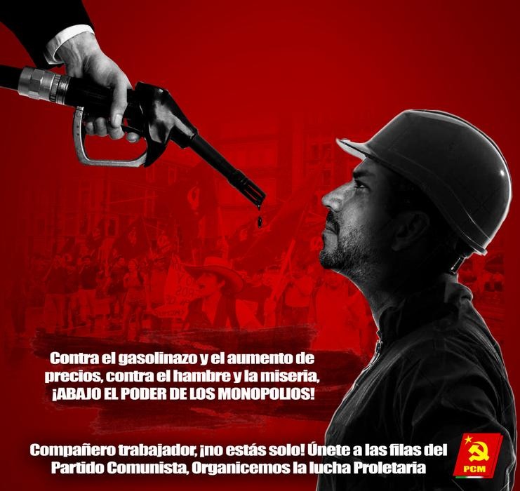 На заставке – плакат Коммунистической партии Мексики. Текст: «Против гасолинасо и роста цен, против голода и нищеты. Долой власть монополий! Товарищ рабочий, ты не один! Вступай в ряды Коммунистической партии, организуем пролетарскую борьбу».