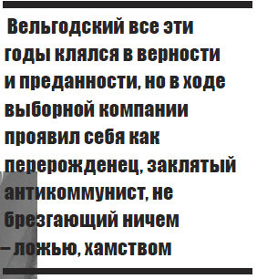 Сейчас он отрабатывает свое предательство в ЗАКСе. Если всех депутатов-коммунистов лишили зарплаты, то ему создали самые комфортные условия: кроме зарплаты депутата добавили еще ряд льгот и немалых, от фракции «Единая Россия». Если депутатам-коммунистам не дают возможности высказаться, на заседаниях отключают микрофон, то ему предоставляется микрофон вне всякой очереди. Если большинство депутатов от той же «Единой России» прошли достаточно жесткий отбор, прежде всего финансовый, то Вельгодскому место в ЗАКСе досталось даром, вне всякой очереди. А ведь если бы заботились об авторитете краевого парламента, то могли бы предоставить место достаточно известному в крае, авторитетному управленцу и опытному администратору бывшему спикеру законодательного собрания В.В. Горчакову, или хотя бы руководителю общества слепых Д. Поташеву.