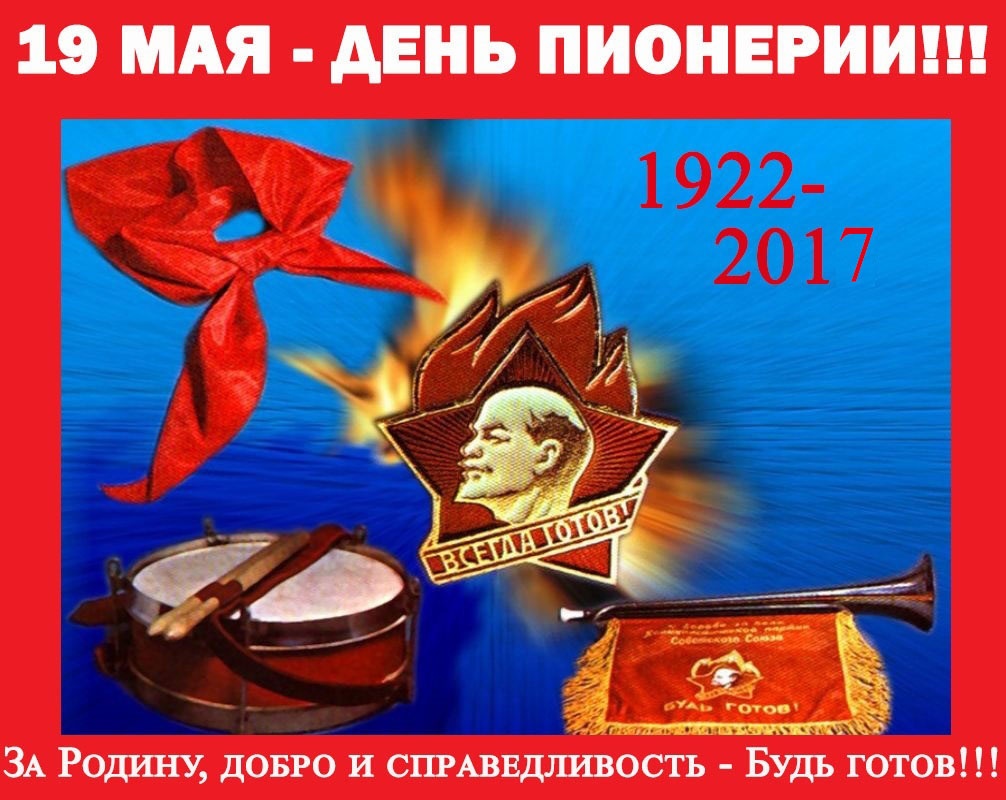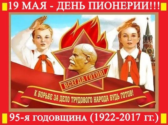 С праздником пионерии Вас, дорогие друзья – пионеры всех возрастов и поколений! Крепкого здоровья, успехов в нашем общем деле, пионерского задора, бодрости духа, уверенности в завтрашнем дне и веры в ПОБЕДУ наших СОВЕТСКИХ ИДЕАЛОВ и СОЦИАЛИЗМА!!!