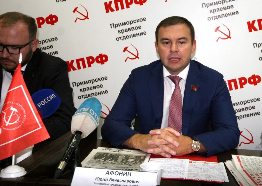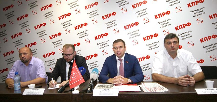В ходе рабочей поездки по Дальнему Востоку после Сахалинской области заместитель Председателя ЦК КПРФ Ю. В. Афонин посетил Приморский край. Во Владивостоке он провел пресс-конференцию, которая вызвала большой интерес региональных СМИ. В общении с журналистами также приняли участие первый секретарь Приморского крайкома КПРФ, руководитель фракции КПРФ в краевом Законодательном собрании А. Н. Долгачев, первый секретарь Владивостокского горкома КПРФ, депутат краевого Законодательного собрания А. А. Самсонов, второй секретарь Приморского крайкома КПРФ, член Приморской краевой избирательной комиссии П. Г. Ашихмин.