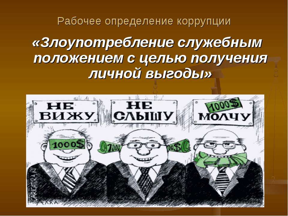 Согласно Федеральному закону о противодействии коррупции №273-ФЗ от 25 декабря 2008 г., коррупция – это злоупотребление служебным положением, дача взятки, получение взятки, злоупотребление полномочиями, коммерческий подкуп либо иное незаконное использование физическим лицом своего должностного положения вопреки законным интересам общества и государства, в целях получения выгоды в виде денег, ценностей, иного имущества или услуг имущественного характера, иных имущественных прав для себя или для третьих лиц либо незаконное предоставление такой выгоды указанному лицу другими физическими лицами.