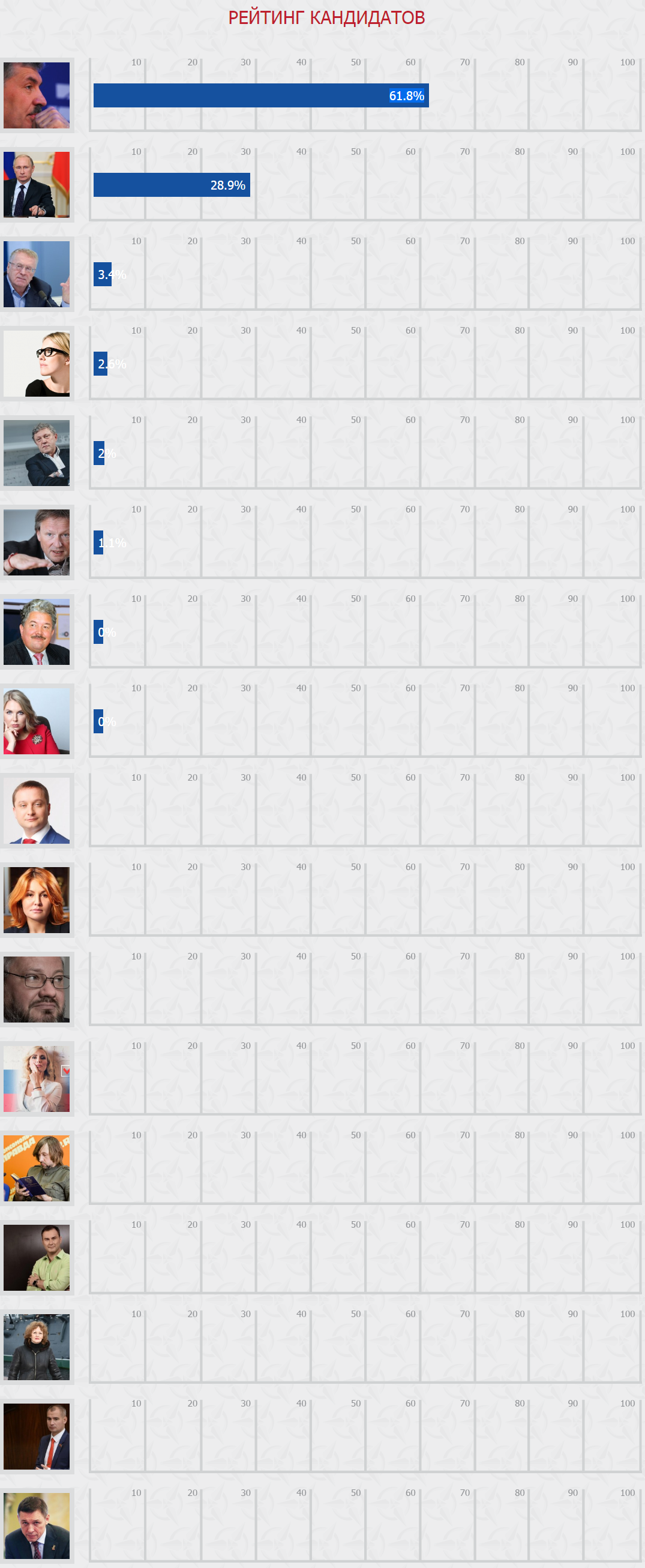 Единственный опрос в сети Интернет, на который я наткнулся, где Путин выходит на первое место, это сайт https://zelv.ru/obshchestvo/66116-prezident2018.html, где следующие результаты: Путин 42% (25669); Грудинин 21% (12721).